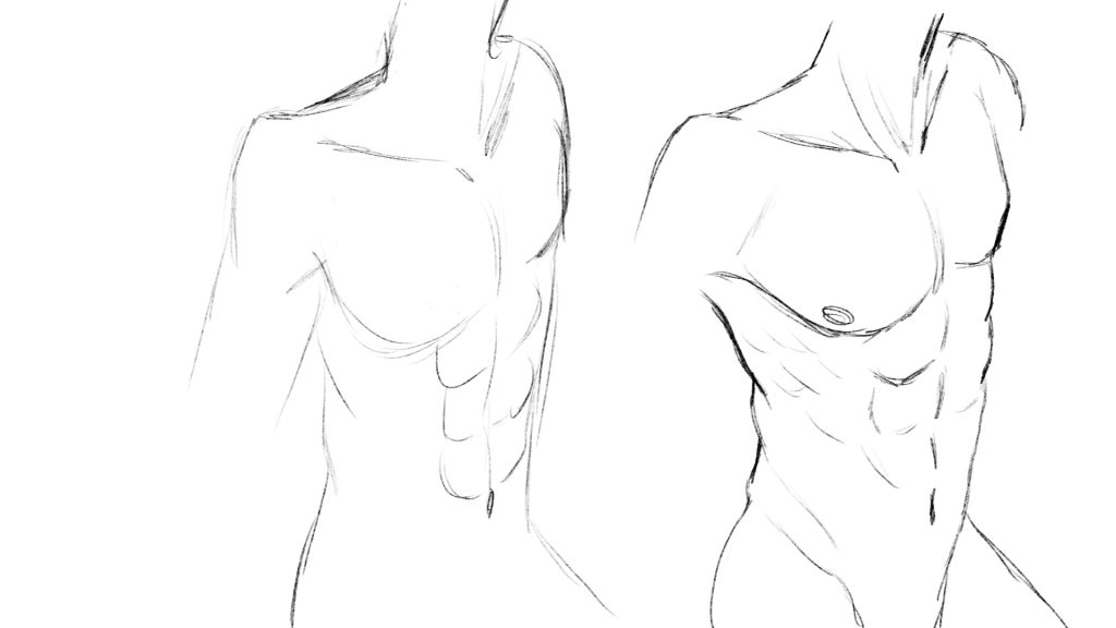 En este ejemplo de ahora, lo que os voy a enseñar es las líneas básicas para representar el torso masculino. Tanto por la parte de delante que ya tenéis algunos ejemplos en este video, cómo por la parte de la espalda que también es importante saber dibujarla.