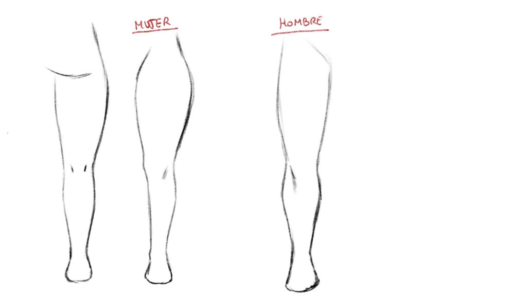 En la imagen siguiente, he dibujado una pierna de mujer por delante y por detrás. De esta forma se puede apreciar bien las curvaturas del cuerpo. Además, dibujamos una de un hombre, para ver las diferencias entre ambos.