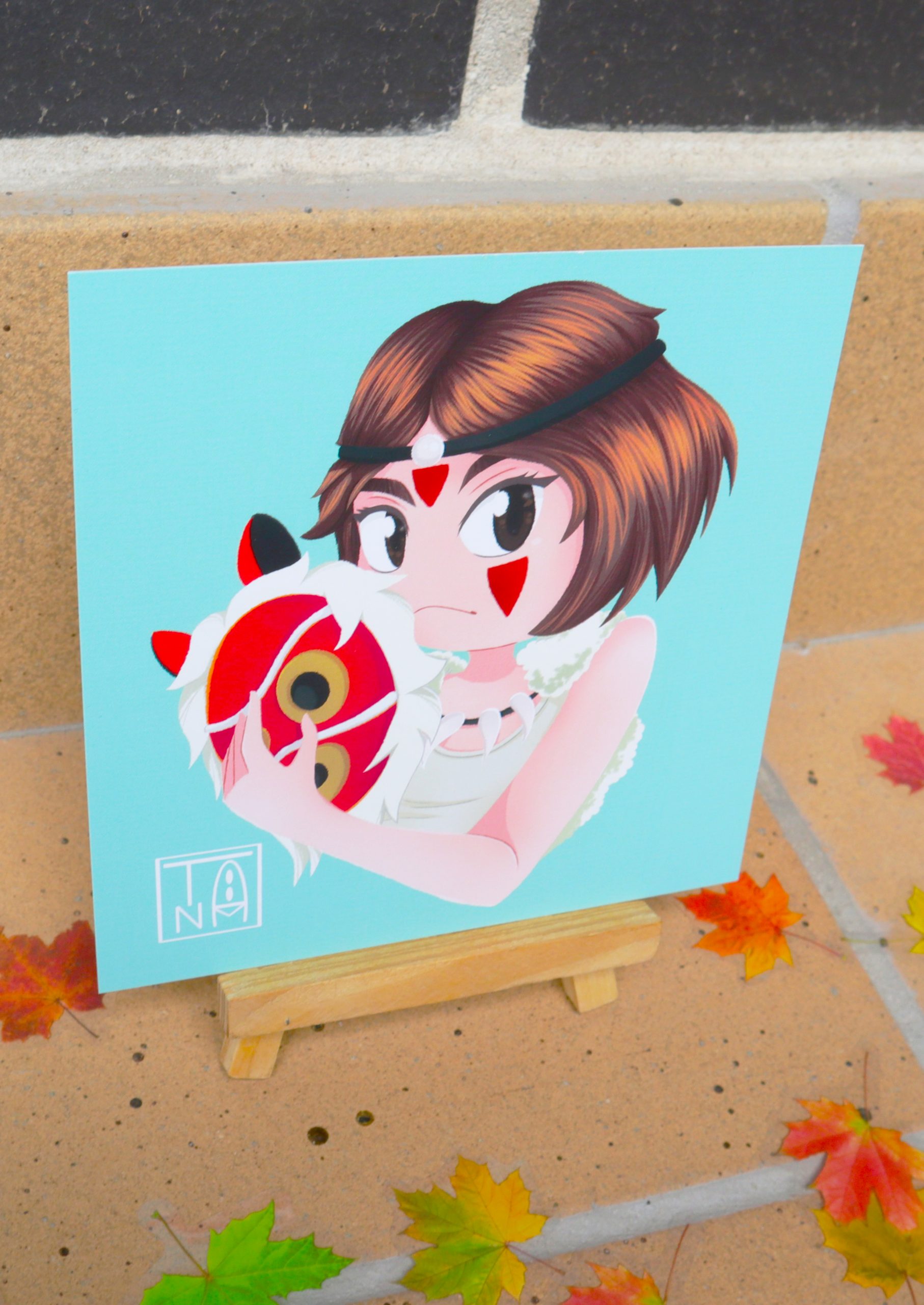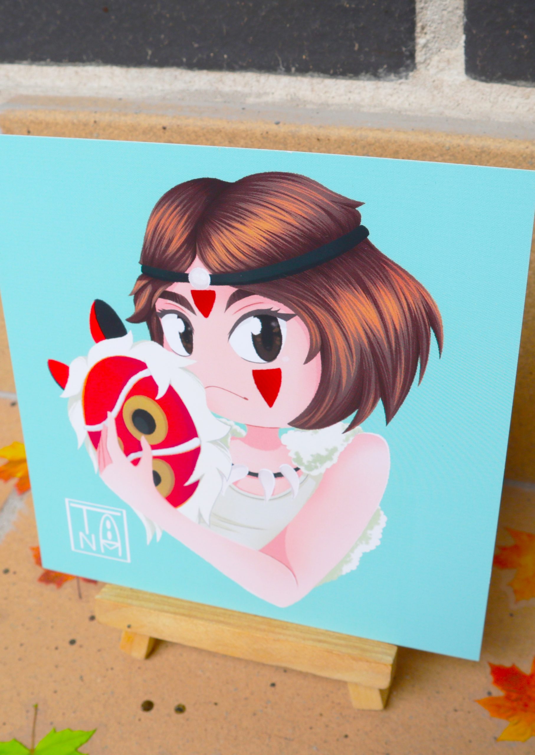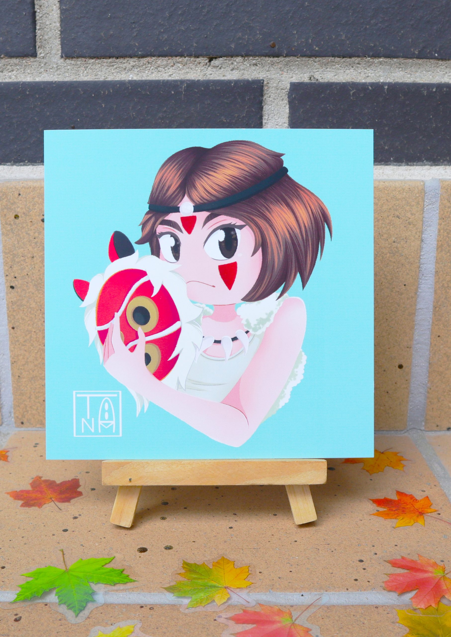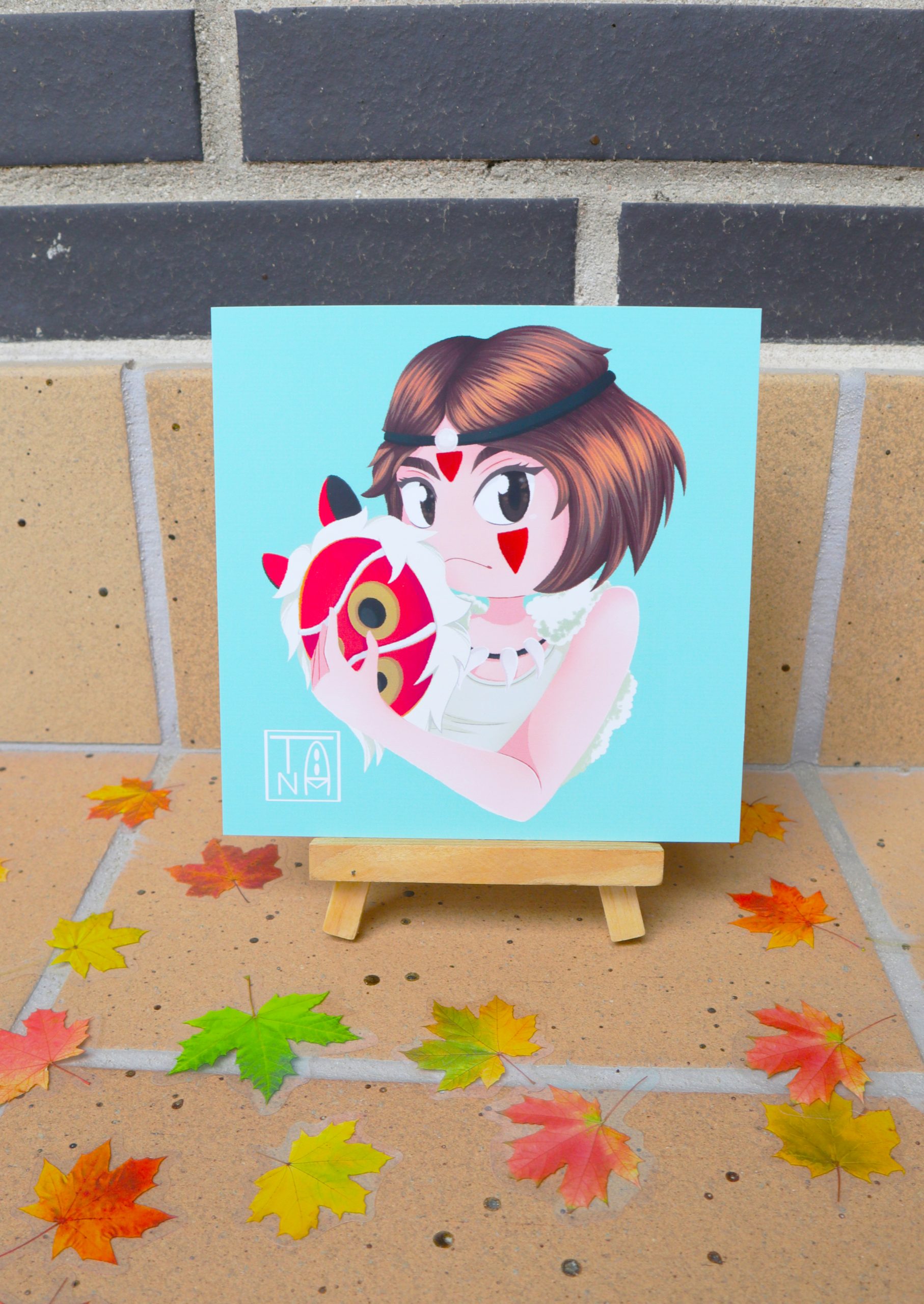 Ilustración exclusiva de Mononoke, la valiente protagonista de La Princesa Mononoke. Impresa en papel premium de 15×15 cm, con diseño original de Timanima. Ideal para fans de Studio Ghibli y coleccionistas de arte. ¡Añade esta obra a tu colección hoy!