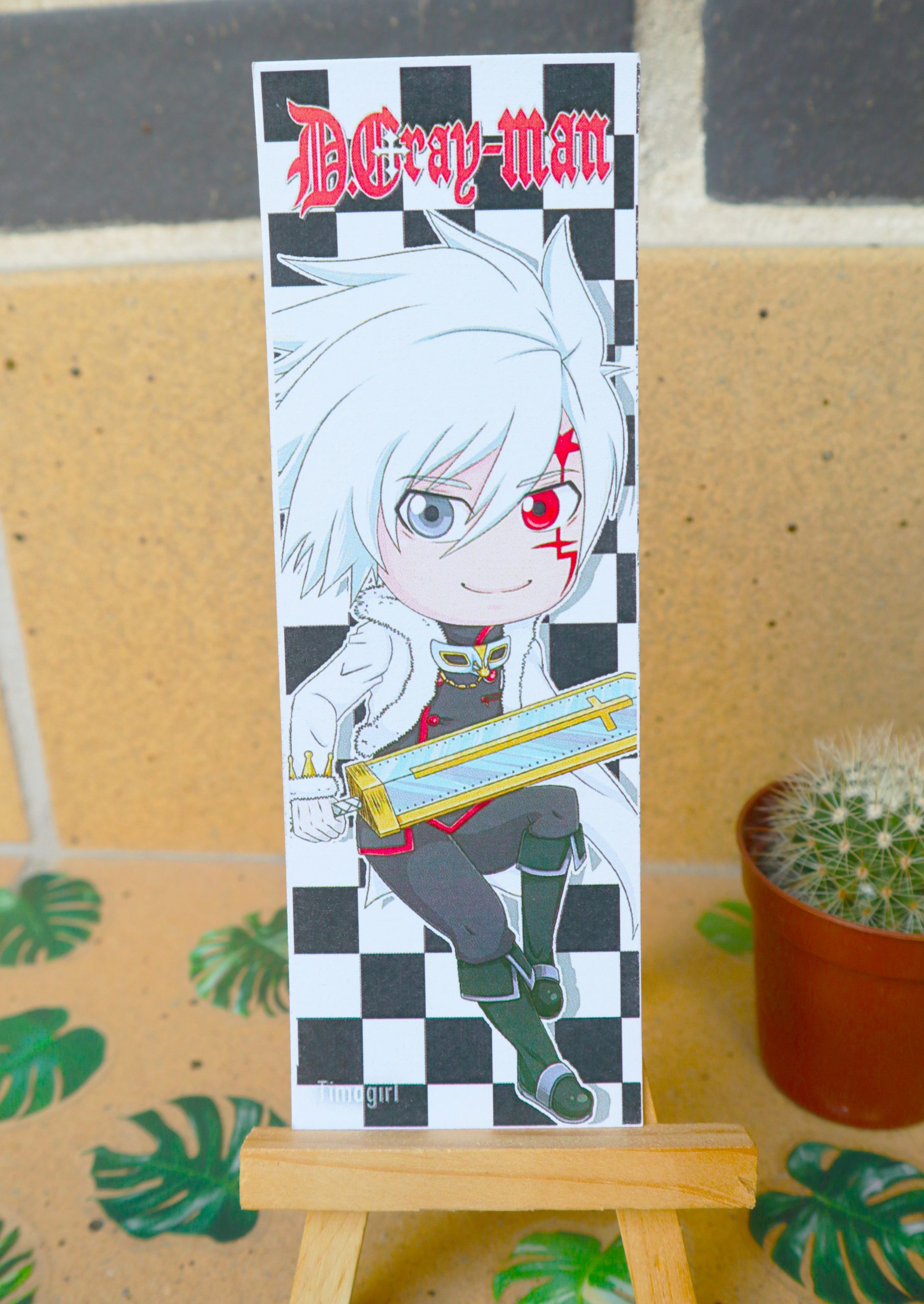 Marcapáginas inspirado en Allen Walker de D.Gray-Man, con ilustración original de Timanima. Fabricado en papel premium de 300 g/m² (5×14 cm) con impresión sublimada para colores vibrantes y duraderos. ¡Un accesorio imprescindible para fans del anime y la fantasía oscura!