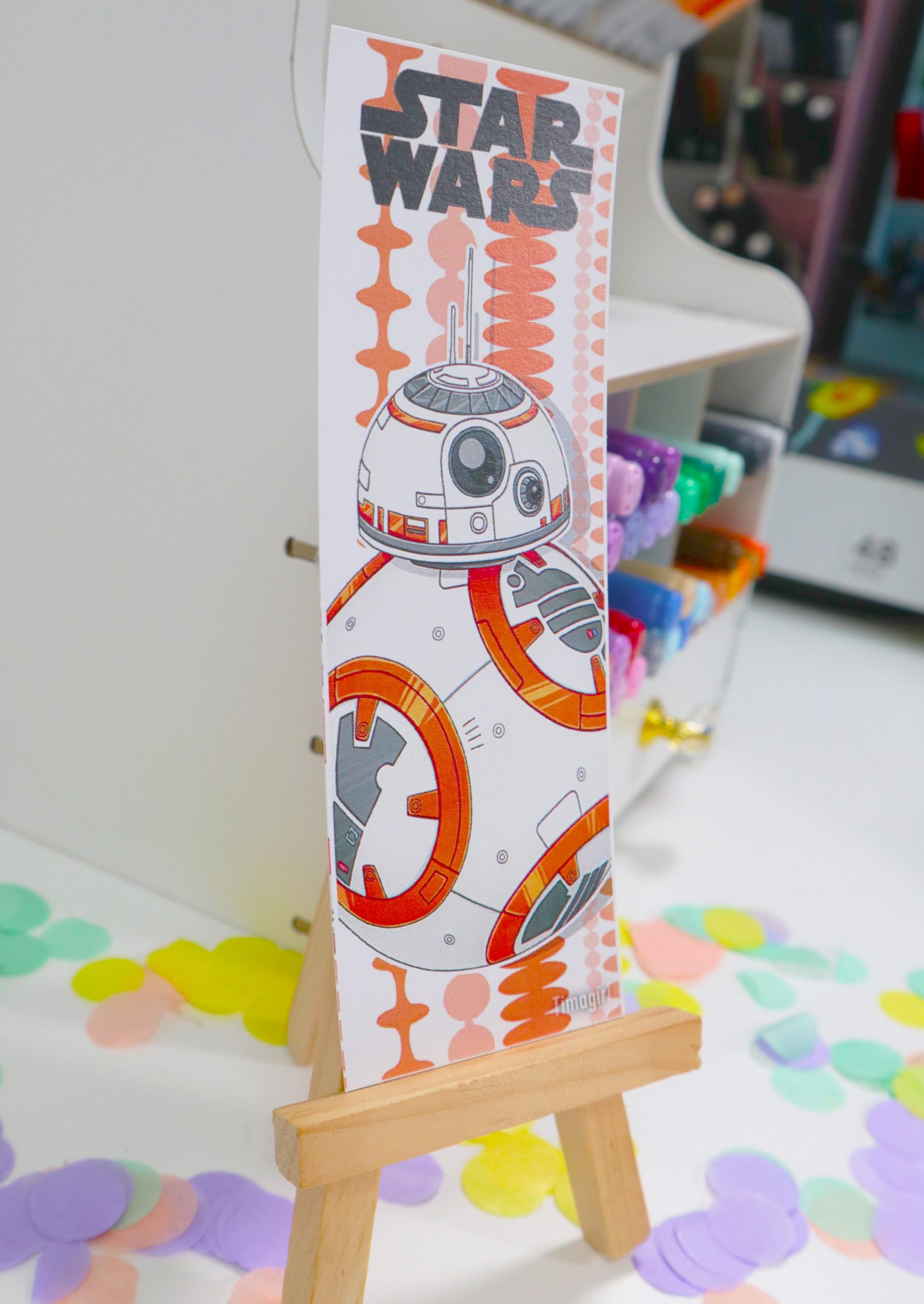 Marcapáginas inspirado en BB-8 de Star Wars, con ilustración original de Timanima. Fabricado en papel premium de 300 g/m² (5×14 cm) con impresión sublimada para colores vibrantes y duraderos. ¡Perfecto para fans de Star Wars y coleccionistas!